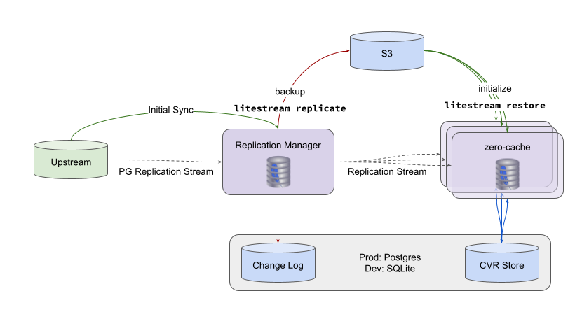 Replication Manager: Serves as the single consumer of the Postgres replication log. Stores a recent subset of the Postgres changelog in the Change DB for catching up ViewSyncers when they initialize. Also maintains the canonical replica, which ViewSyncers initialize from.